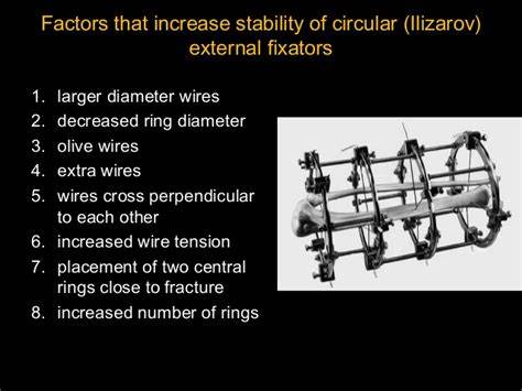 그 외에도 피 없이 클램프 형태의 고정기, 하이브리드 외고정기, 내고정술과 혼합, half pin fixator 등이 있습니다. 환형의 대표적인 것이, 일리자로프 고정술(ilizarov EF) 인데, 이는 축성 stiffness를 25% 증가시키며, bending이나 shear stiffness 는 거의 비슷합니다. 최근 경향으로는 half pin frame 을 사용하고 불안정 골절이 유합될때까지 외고정기를 유지합니다.