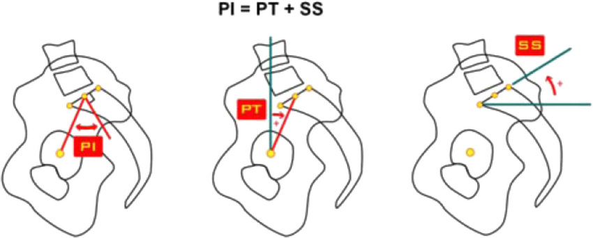 PT(정상 13+_6도) 가 증가되어 있으면 retroveted pelvis, 감소되어 있으면 anteverted pelvis