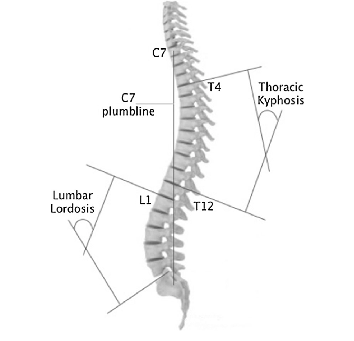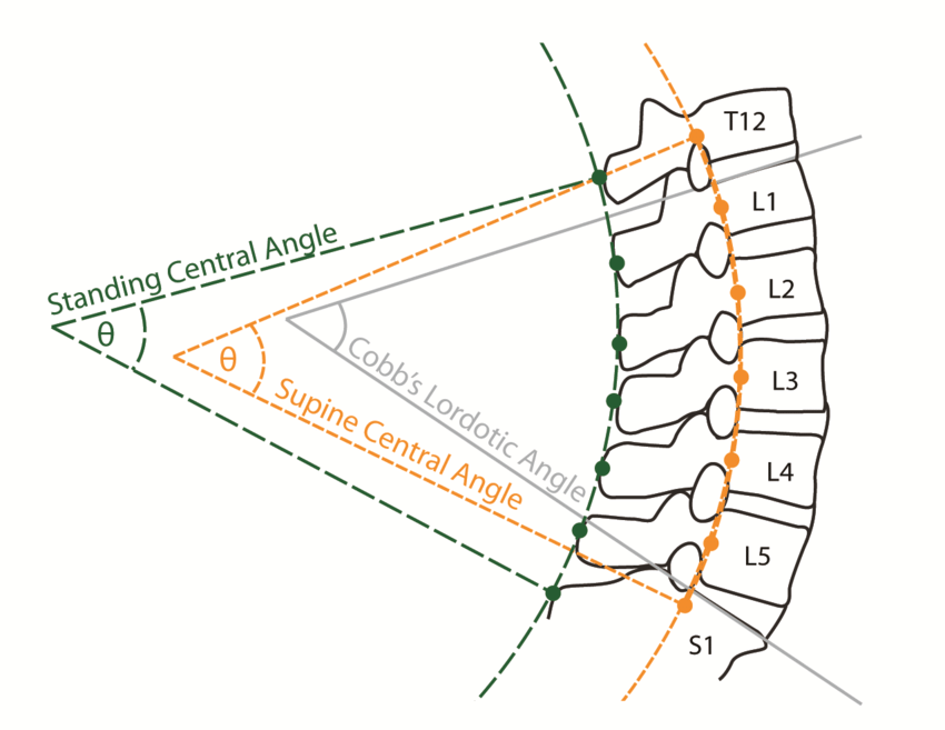 요추 전만각을 측정하는 방법은 여러가지가 있지만, 주로 Cobb's angle 방법으로 L1 윗부분과 S1 윗부분의 각을 측정하여 확인하게 됩니다.(Lumbar lordosis) 흉추각도 마찬가지로 T4와 T12 윗부분을 통해 측정합니다.