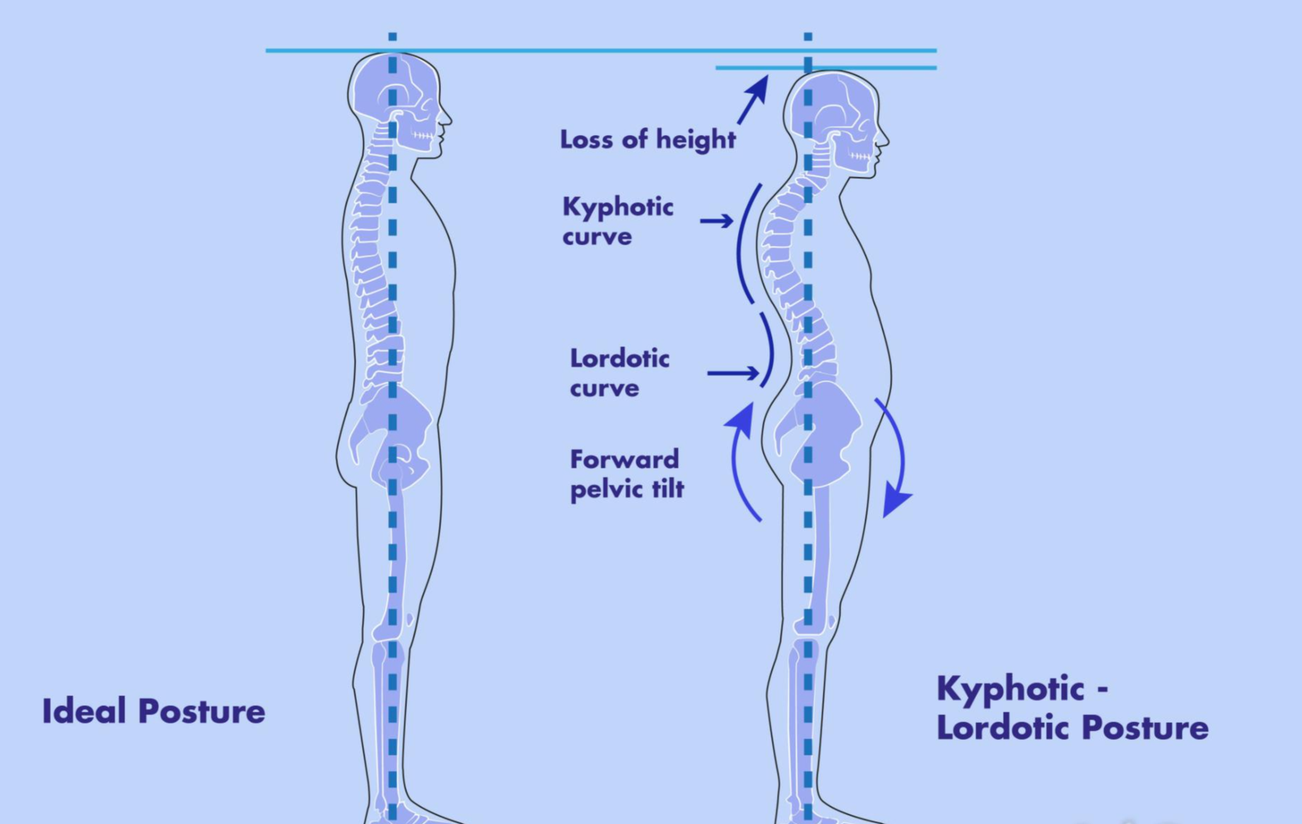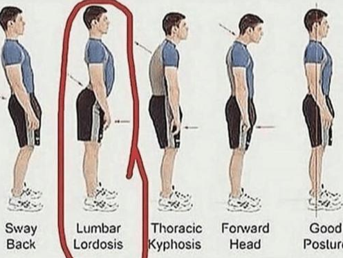 흉추의 후만각이 증가되며 골반각이 후굴화 되고, 골반 기울기가 후방으로 기울게 되며, 무릎을 굽히게 되고, 발목을 배굴 하게 됩니다.