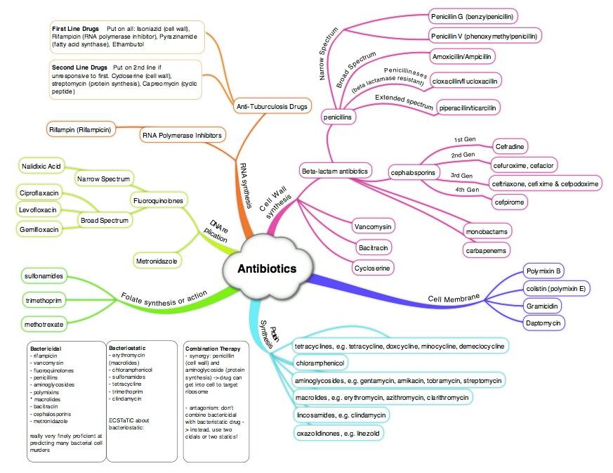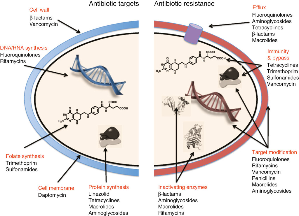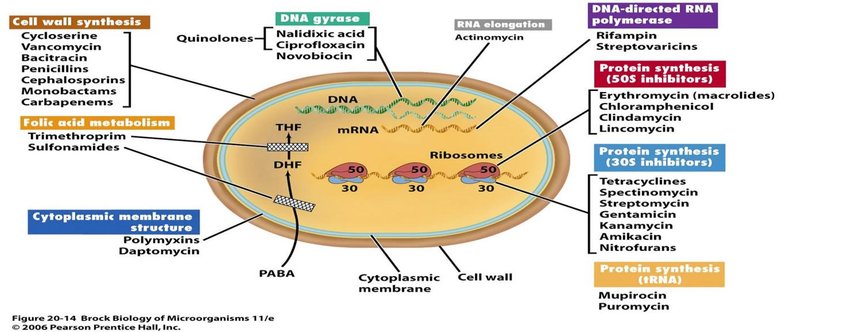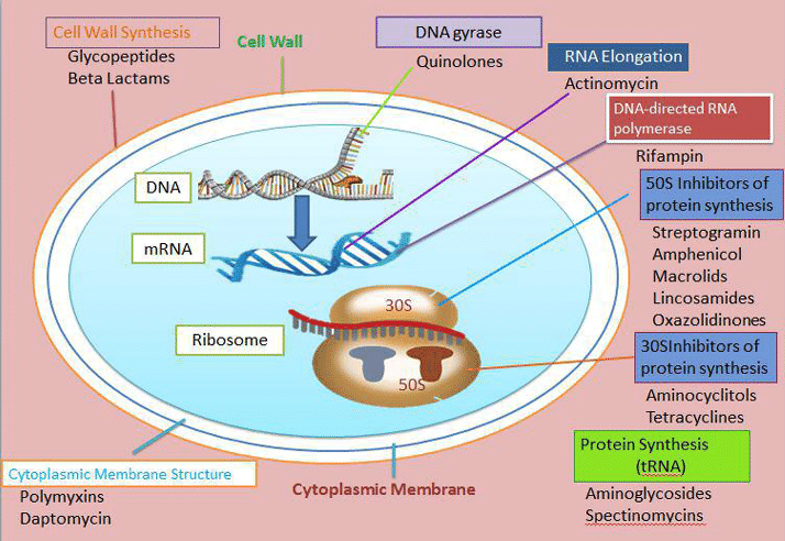 세포벽, DNA 합성, RNA 연장, DNA-RNA폴리머라제, 50S단백질합성, 30S단백질합성, 단백질합성, 세포질막 정도로 세균이 번식하는 메커니즘을 정리해 볼 수 있습니다. 대표적인 메커니즘과 함께 어떤 항생제 그룹이 있는지 이해를 해야합니다.