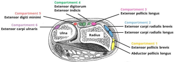 제 6구역 은 척측 손목을 펴는 근육과 관련이 있습니다. : Extensor carpi ulnaris (ECU)