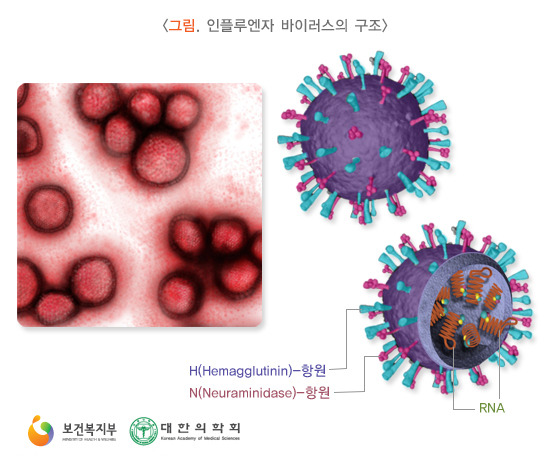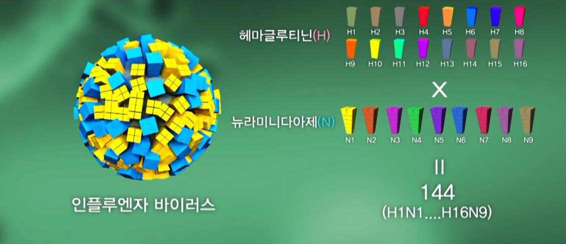 바이러스는 기본적으로 헤마글루티닌(H)과 뉴라미니다아제(N) 로 이루어져 있습니다. H는 16가지, N은 9가지가 됩니다. 이 조합은 거의 144가지가 나오는 것이지요.