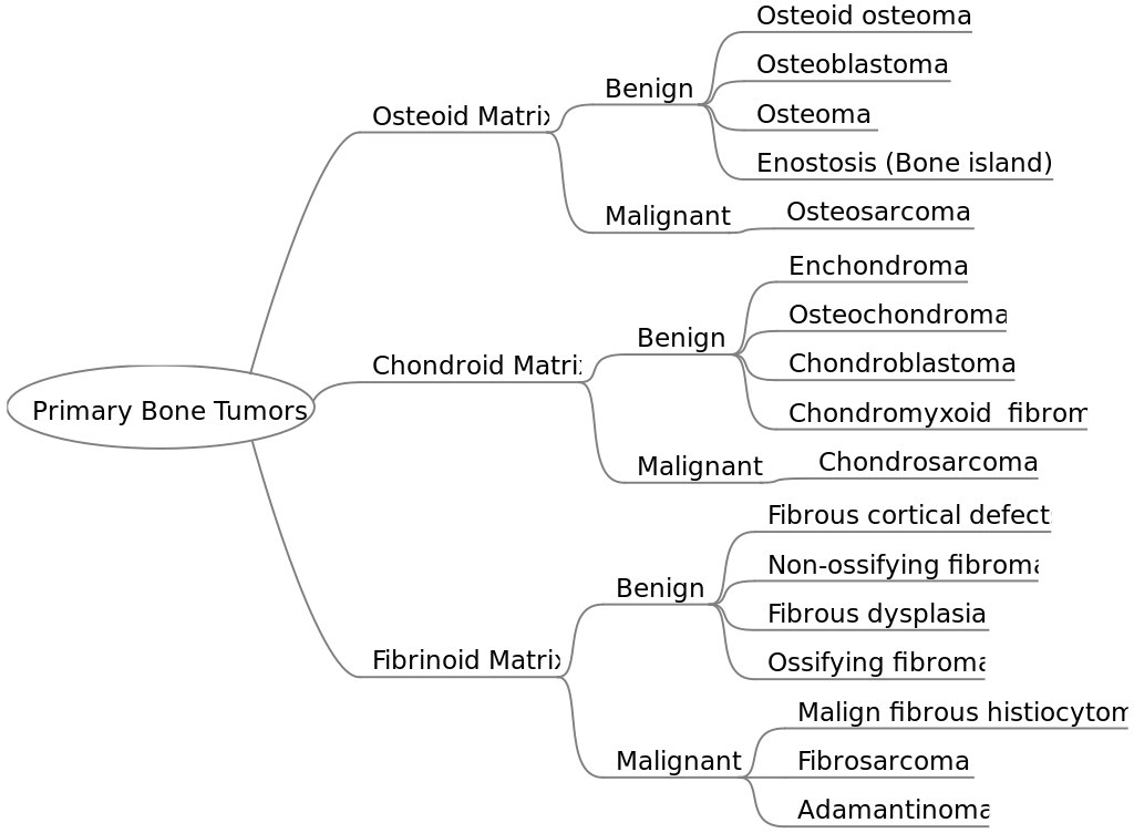 종양은 크게 양성종양과 악성종양으로 나뉠 수 있는데, 악성종양은 다른 장소로 이동하여 독립된 종양을 발생 시킬 수 있습니다. 양성종양과 악성종양을 분류했으면 그 안에서 어떤 '형성된 기질' 에 따라 나뉠 수 있습니다. 양성종양의 경우 골종, 골연골종, 골섬유종 등과 같이 악성종양의 경우 골육종, 연골육종, 섬유육종, 낭종, 기타(miscellaneous)로 나뉠 수 있습니다. 분류가 워낙 다양하고 많기 때문에 표 등으로 정리해서 보는 것을 추천합니다. (세계보건기구의 분류표는 기질에 따른 분류로만 일단 나누어져 있습니다. 물론 골연부종양의 발생위치나, 발생연령에 따라 재분류 할 수도 있습니다. )