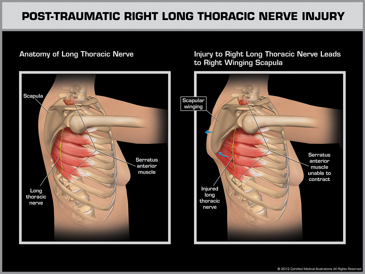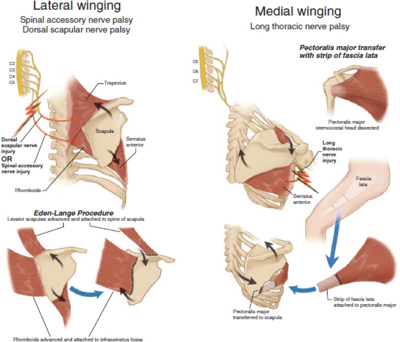 "Long Thoracic Nerve Injury" 입니다. 날개뼈가 뒤안쪽으로 말려들어갔다는 것은 바깥쪽을 잡아주는 근육이 늘어났다고 이해하면 됩니다. 바깥쪽 근육이 바로 Serratus Anterior muscle 이며 이는 long throacic nerve 영향을 받습니다.