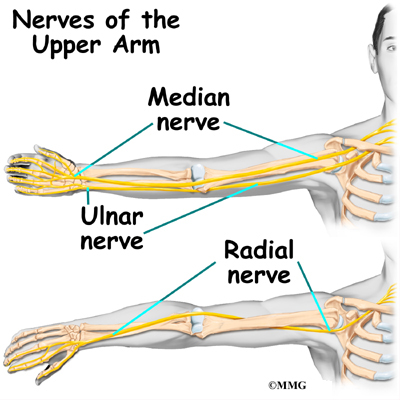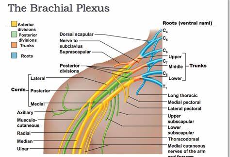 어깨에서 나온 신경이 다음과 같이 주행하고, 팔 끝까지 이어진다는 개념을 갖고 있으면 더 이해하기 쉽습니다.
