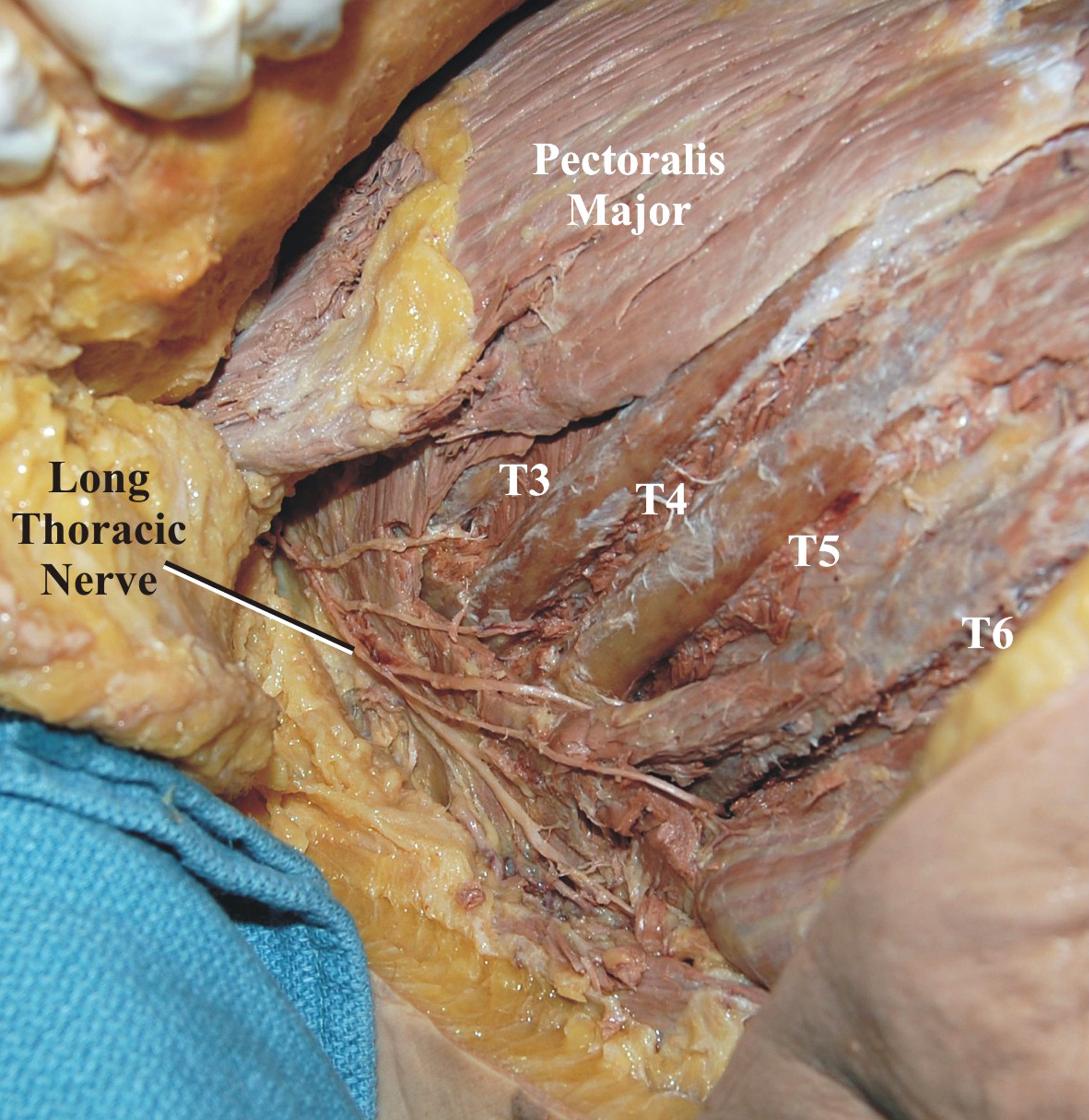 "Long Thoracic Nerve Injury" 입니다. 날개뼈가 뒤안쪽으로 말려들어갔다는 것은 바깥쪽을 잡아주는 근육이 늘어났다고 이해하면 됩니다. 바깥쪽 근육이 바로 Serratus Anterior muscle 이며 이는 long throacic nerve 영향을 받습니다.