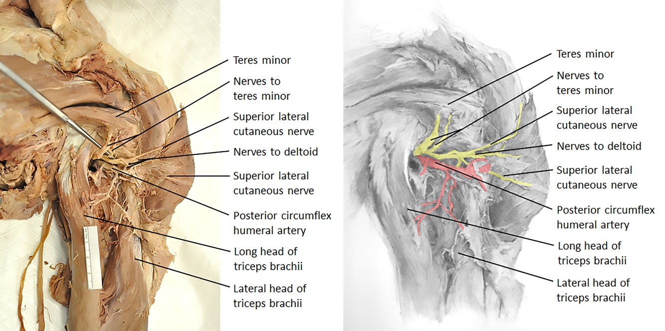 한가지씩 확인해 보면 우선 가장 먼저 보아야할 신경은 액와신경(axillary nerve)입니다.