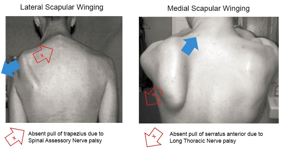 아까와는 반대로 척추와 가까운 안쪽근육들의 마비가 동반되기 때문에 견갑골이 바깥으로 밀려나게됩니다.