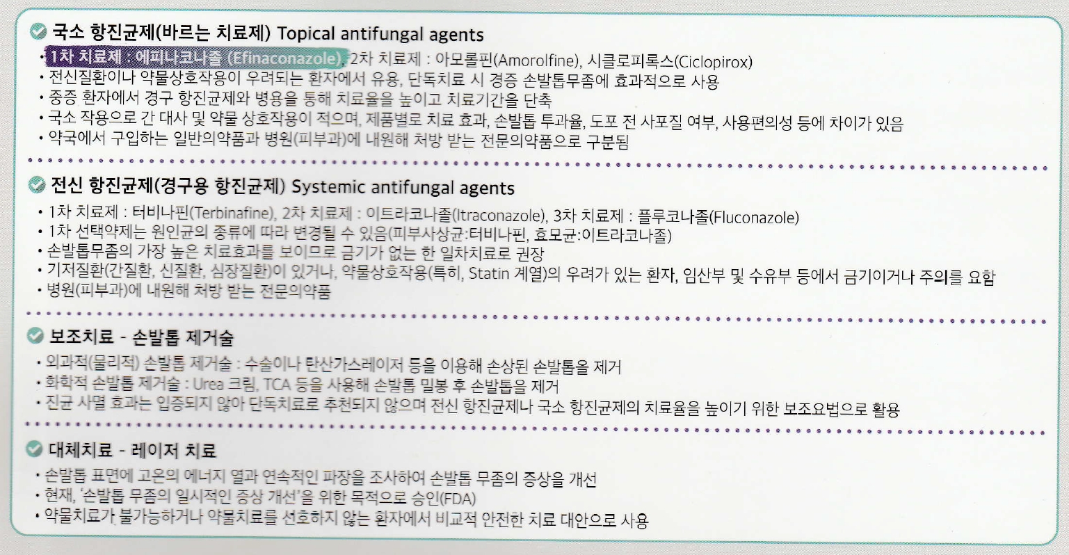 국소 항진균제로는 에피나코나졸, 아모롤핀, 시클로피록스 가 있습니다.