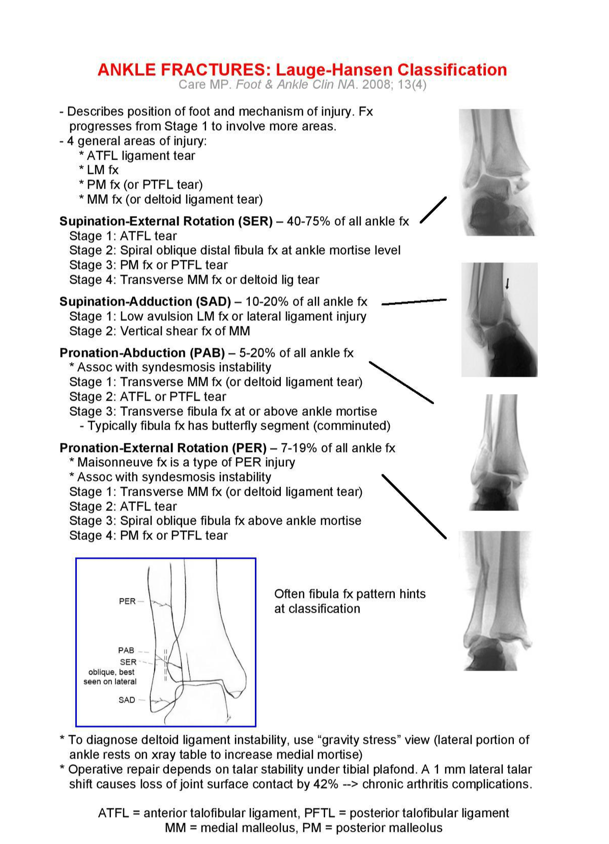 높이에 따라 A, B, C 로 나눌 수 있고 B의 경우 경골과 비골이 연결되는 연결인대가 손상되는 경우에 해당됩니다. Lauge Hansen은 골절의 회전방향이나 발의 방향에 따라 손상되는 것을 파악하게 되는데, 나중에 나오겠지만 비골의 높은 골절이 동반되는 경우 PER type 인 경우가 많습니다.