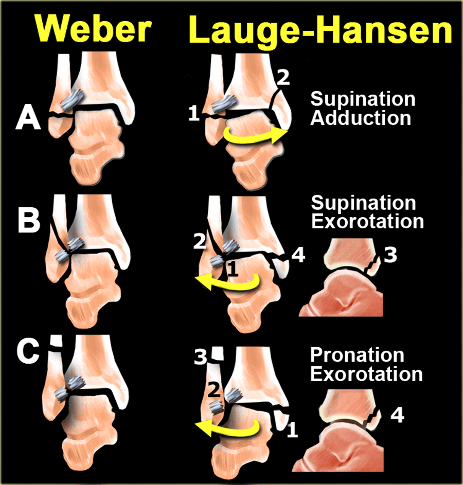 'Weber type 과 Lauge-Hansen' type 입니다. 이 것들은 손상의 정도나 매커니즘을 유추할 수 있지