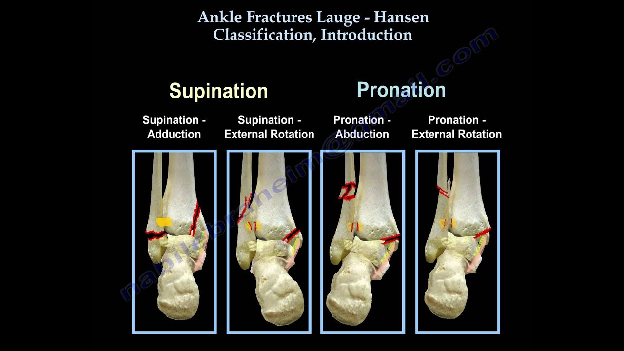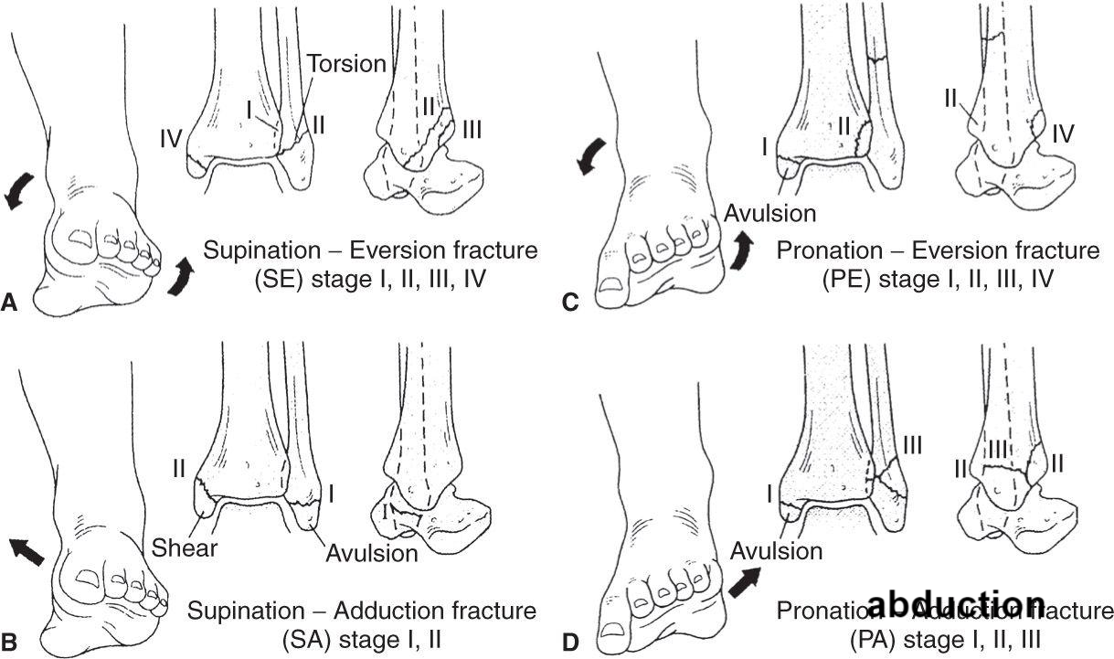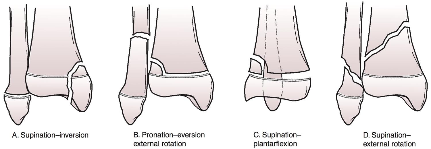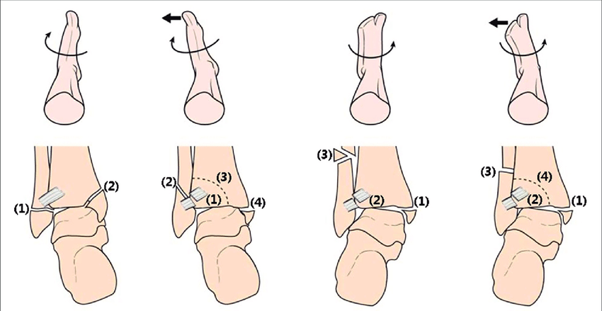Supination의 경우 주로 비골의 손상이 먼저 동반되게 되며, Pronation 의 경우 Medial malleolus 부위가 먼저 손상 받습니다. Tibia lat 면에서 생기는 Chaput fragment 는 Pronation 에서 생깁니다.