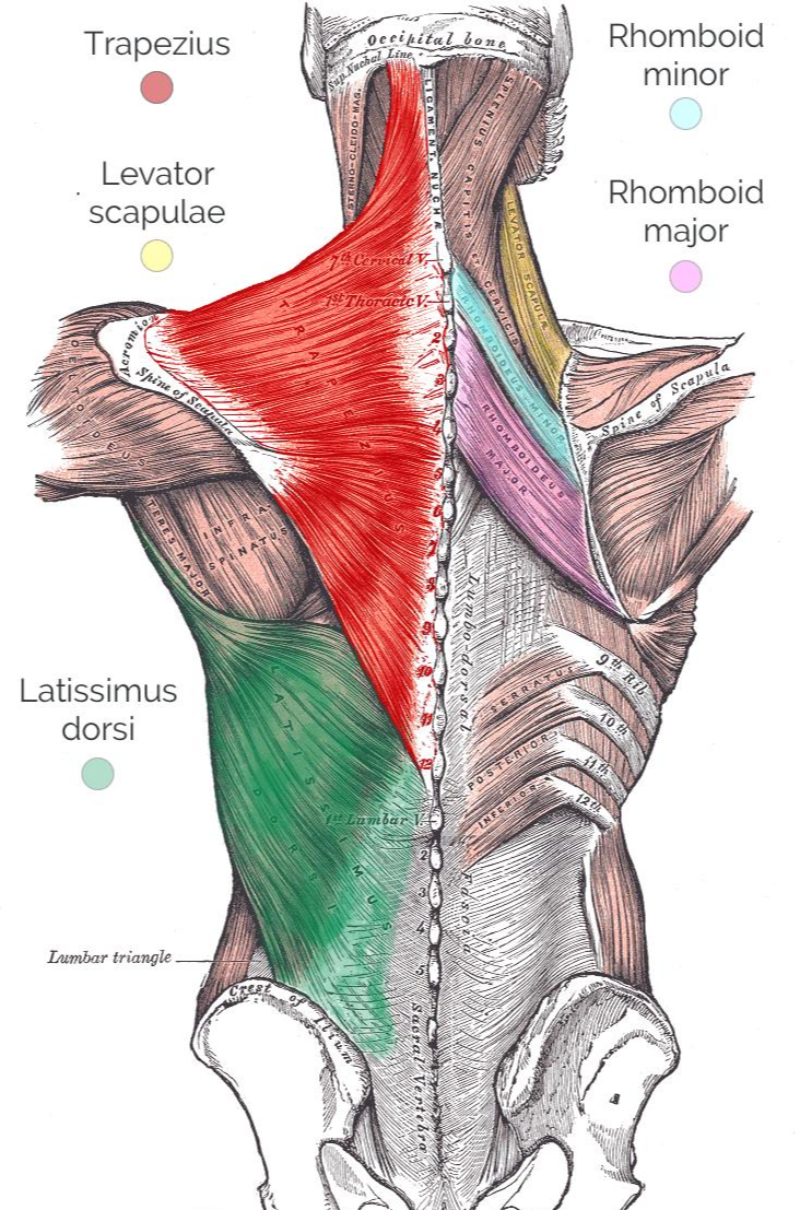 어깨와 연결되어있는 척추후방, 즉 등 근육 부위도 종류가 단순한 편이라, 아래그림 정도로만 이해하고 외우면 될 것 같습니다.