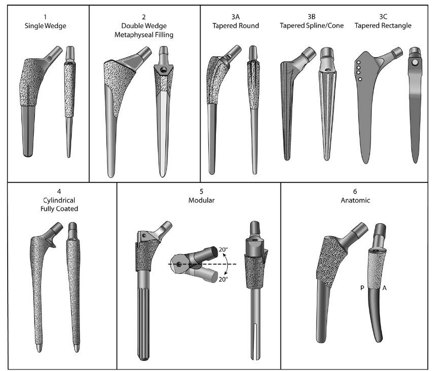 응력방패(stress shielding)가 크기 때문에, Dorr type C 등에서 사용하면 안됩니다. coating된 diaphysis에서 주로 고정이 이루어지게 됩니다.