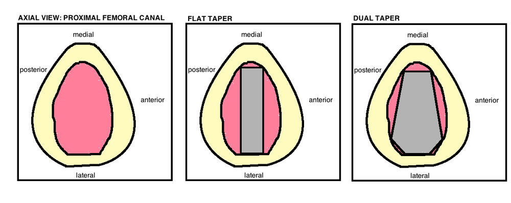 Stem diaphyseal portion에서 posterior 에서 anterior bowing 이 있어서, 좌-우 stem 용이 따로 존재하게 됩니다. 높은 합병증, 통증으로 거의 사용되지 않습니다.