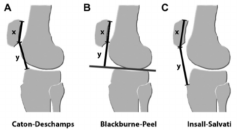 2. Insall and Salvati (0.8-1.2) : Patella tendon길이/Patella 길이 ( patella alta 의 경우 올라가므로, patella tendon 이 길어져 1.2 보다 높아집니다.)