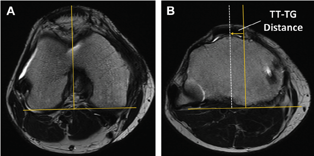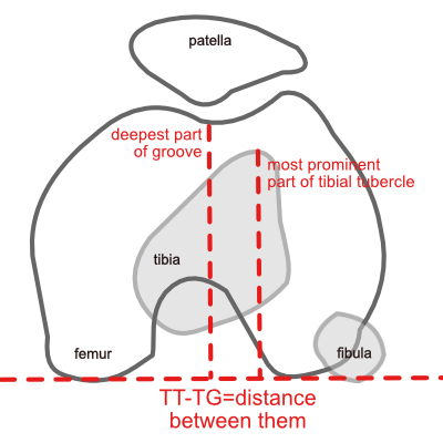 30도 flexion 한 상태에서 axial CT 를 촬영하여 TT-TG(Tibial tuberosity- trochlear groove) distance 를 측정하여 13mm 가 정상이며 20mm 이상인 경우 확실하게 비정상이 있다는 것을 확인해 볼 수 있습니다.