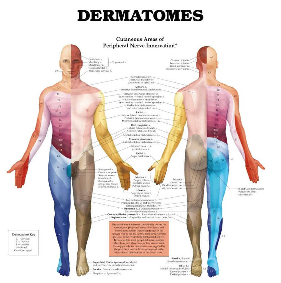흔히 감각 신경의 손상은 dermatome을 생각하면 유추하기 쉽습니다. 하지만 그 신경근이 손상을 받는다고 하여 정확히 그 기능이나 근육이 손상되는 경우보다는 혼재되어 나타나는 경우가 많습니다. 신경근이 모여서 다양하게 작용하기 때문이죠. (한 근육에도 두개의 신경근이 섞여서 작용할 수도 있습니다.)