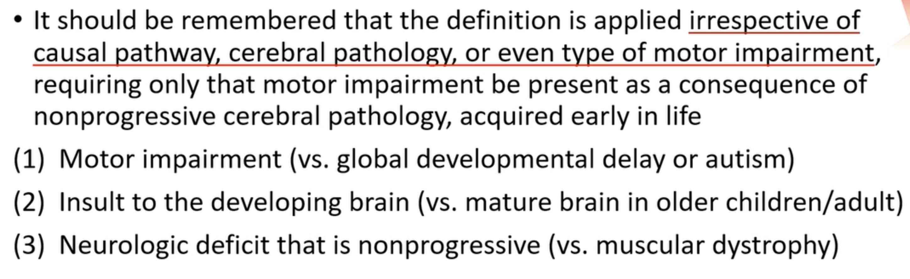 예전보다는 감염이 많이 줄어서 이전보다는 발생률이 많이 준 질병입니다. 과거 폴리오 바이러스로 인해 많이 발병했으나, 백신이 생기고나서 많이 줄어들었습니다. 뇌성마비는 미성숙한 뇌에서 비진행성 병변으로 인한 운동 및 자세 장애가 생기는 것을 의미합니다. 뇌의 병변은 비진행성이기 때문에 운동장애가 있다면 그 운동장애를 평생가지고 살아갈 확률이 높습니다. 이러한 환자군에서 치료의 목표는 더 악화되지 않게 재활을 하는 것과, 최대한 보행을 할 수 있게끔 하는 것 입니다.