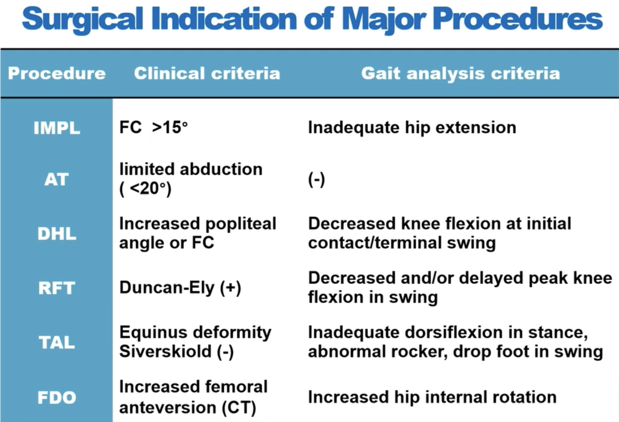 hamstring spasticity 및 tightness 는 supine에서 고관절 굴곡시 무릎이 굽혀지는 각도를 측정(슬와각도)해 확인할 수 있습니다. 무릎이 신전되지 않으며, SLR 70도 이하 혹은 슬와 각도가 45도 이상인 경우 hamstring 연장술을 해야하며 심한 경우 대퇴부 과상부 신전 절골술을 시행해 볼 수 있습니다.