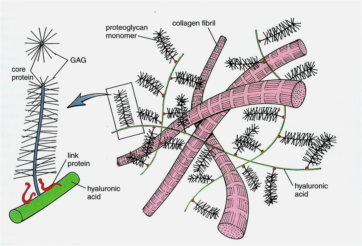 proteoglycan(다당단백)은 감소합니다. (동화작용- 교원질 생합성 증가, 이화작용은 더욱 증가하여 -> 전체양 감소)