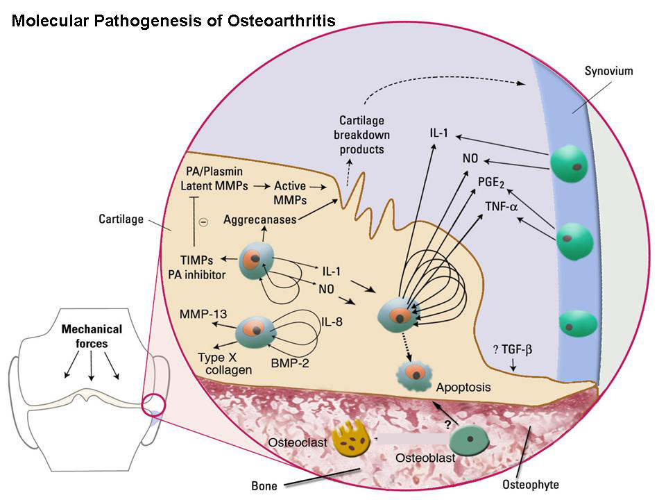 퇴행성 관절염은 interleukin-1, MMP(matrix metalloproteinase), TNF-alpha, TNF-beta, collagenase증가, PGE2증가 에 의해 이화작용이 증가하기 때문에 이 cytokine들을 억제하는 것이 퇴행성관절염의 치료가 될 수 있습니다.