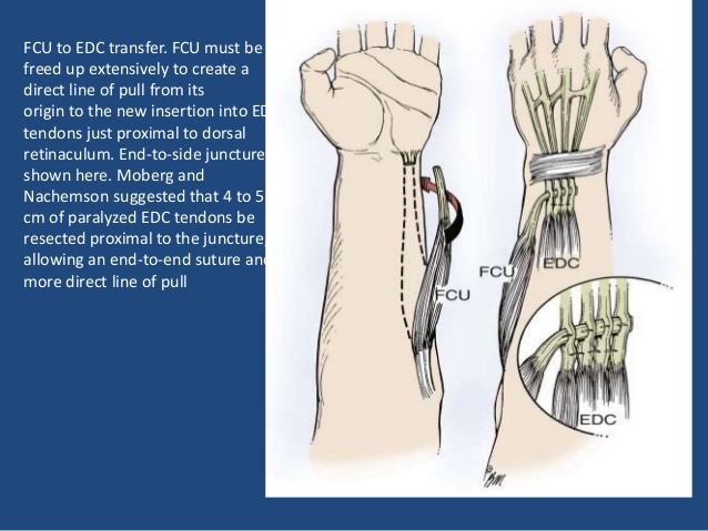 lower lesion의 경우 손목의 신전은 유지되기 때문에 손가락의 폄근만 이전하면 될 것 입니다.