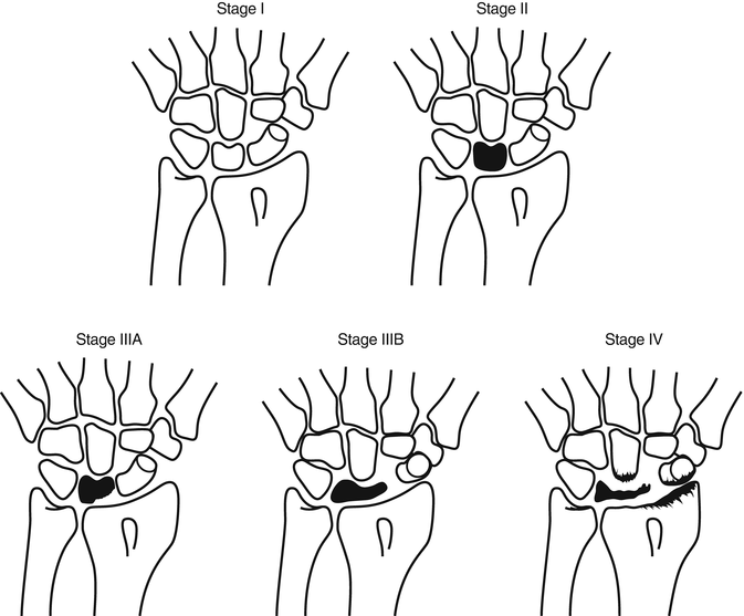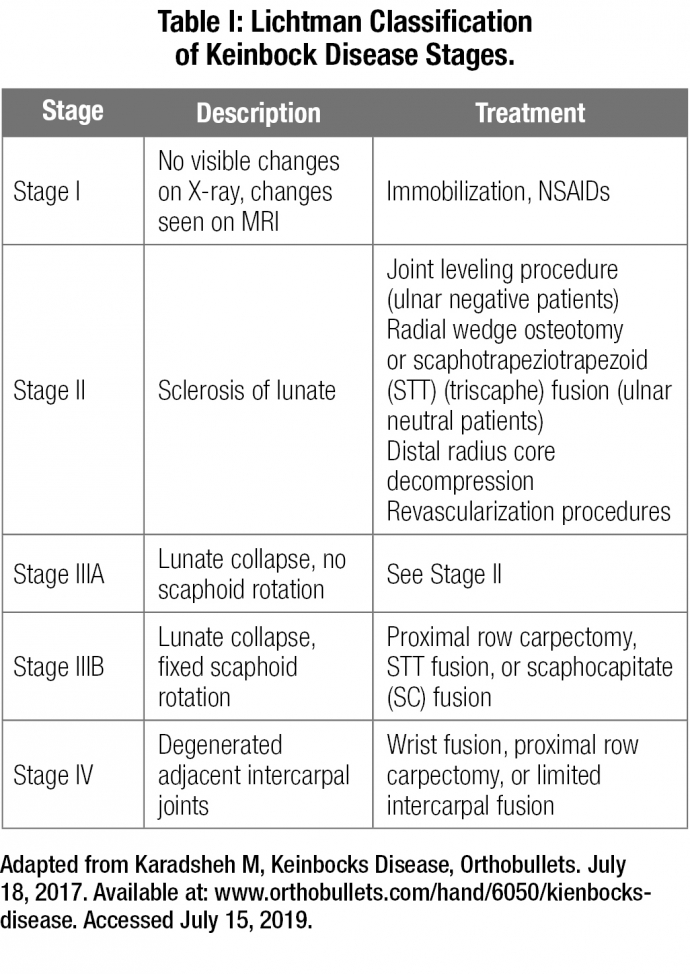 Lunate 의 sclerosis가 발견되면 Stage II 이며 Joint leveling 이 핵심입니다. ulna 변위가 중립 혹은 양성인 경우에는 radial wedge osteotomy나 그 외의 치료를 시행해 볼 수 있습니다.