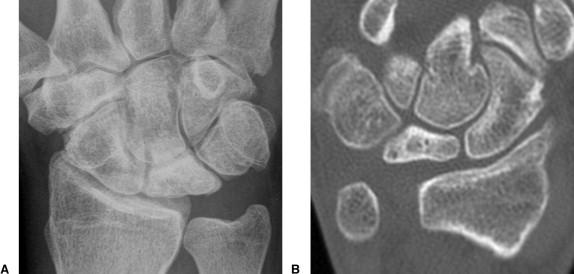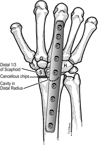 Stage III 부터는 주상골도 영향을 받기 시작하며 회전을 하거나(IIIA, cortical ring 관찰가능), carpal height 가 줄어드는 것을 확인할 수 있습니다. (IIIB), IIIA 까지는 II와 치료를 거의 동일하게 하지만, IIIB 부터는 Proximal row carpectomy 나 STT, SC fusion 등을 시행해 볼 수 있습니다.