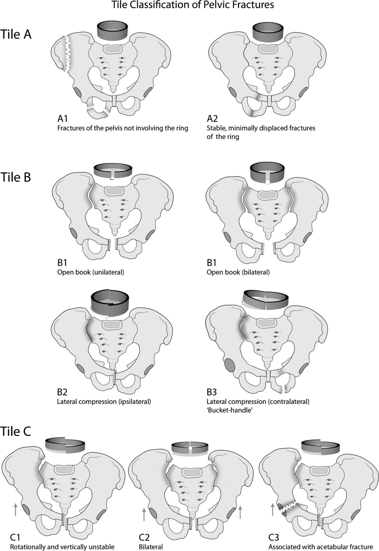 골반골 골절은 Stable에 따라서 Tile classification 으로 나뉠 수 있습니다. A는 stable, B는 partial stable, C는 Unstable(posterior arch파괴) 에 해당됩니다.