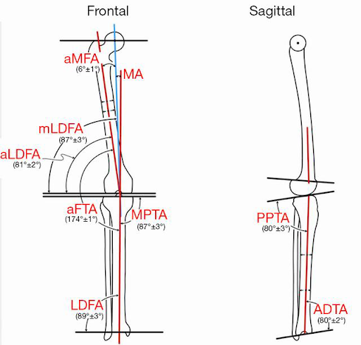 frontal plane에서 mechanical angle과 anatomical angle을 고려할 수 있으며 sagittal plane 에서는 anatomical angle을 확인할 수 있습니다.
